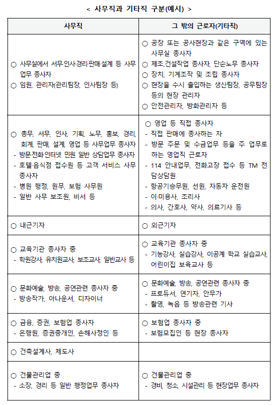 - 위의 경우라도 생산업무에 종사하는 근로자와 같은 구역에서 근무하는 근로자의 경우에는 사무직 근로자가 아닌 그 외 근로자에 해당