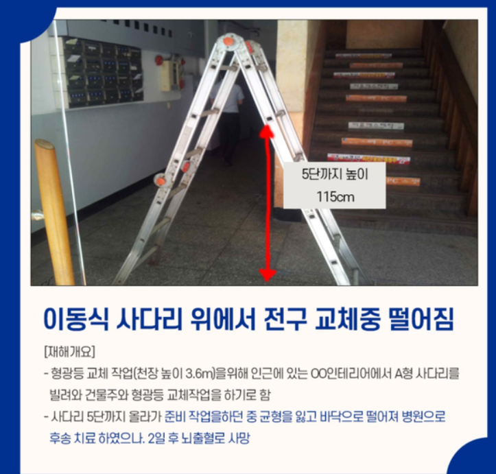 간혹 보면 말비계 하단의 고무 패킹이 훼손되어 미끄럼 방지가 제대로 되지 않는 말비계를 사용하는 경우가 간혹 있고 답단이 파손되거나 변형 된 경우도 종종 볼 수 있습니다.