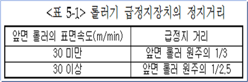 다. 롤러기의 급정지장치는 롤러기를 무부하에서 최대속도로 회전시킨 상태에서도 <표 5-1>과 같이 앞면 롤러의 표면속도에 따라 규정된 정지거리 내에서 당해 롤러를 정지시킬 수 있는 성능을 보유해야 한다.